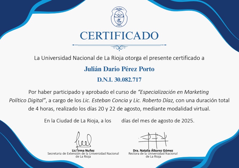 – Curso de especialización en “Marketing político digital”, dictado por la Universidad Nacional de La Rioja (UNLaR).