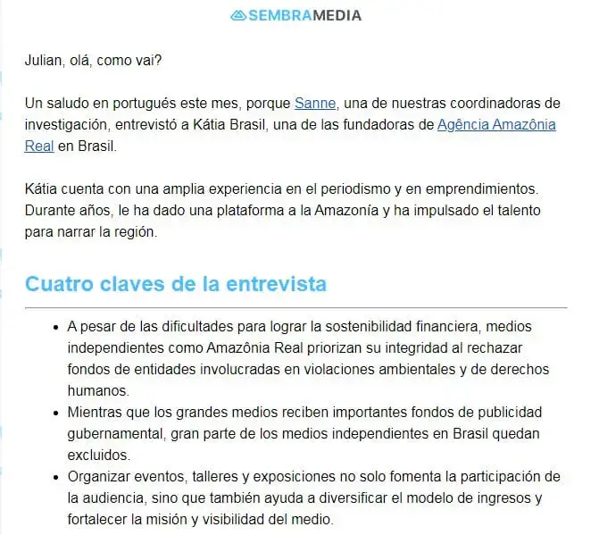 Cada mes, se elige un medio y se entrevista a algún responsable o directivo. En conversaciones extensas, el protagonista cuenta la historia del emprendimiento y su modo de trabajar. Para recibir este newsletter es necesario completar los datos en el sitio web de SembraMedia.